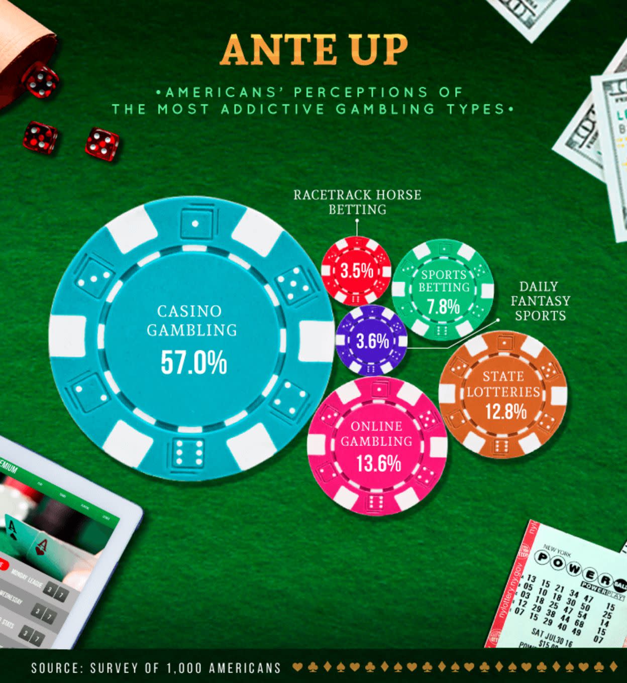 When gambling transforms from a casual hobby or pastime to a need or compulsion, it’s possible addiction has taken over. Characterized by an uncontrollable urge to keep gambling, research has linked the brain’s reward system stimulated by compulsive gambling to drug and alcohol misuse. Based on our poll, Americans had differing opinions on which type of gambling was the most addictive of all.