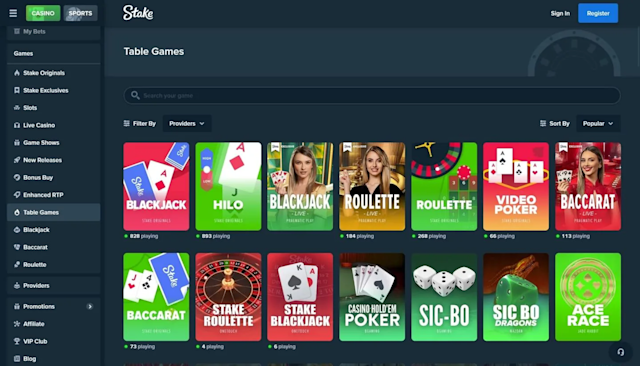 The neat organization makes it easy to navigate Stake.com, with games broken down into categories such as slots, live, table games, and more. Once you are in a specific game section, you can narrow down your search by filtering through providers or popular and new titles.
