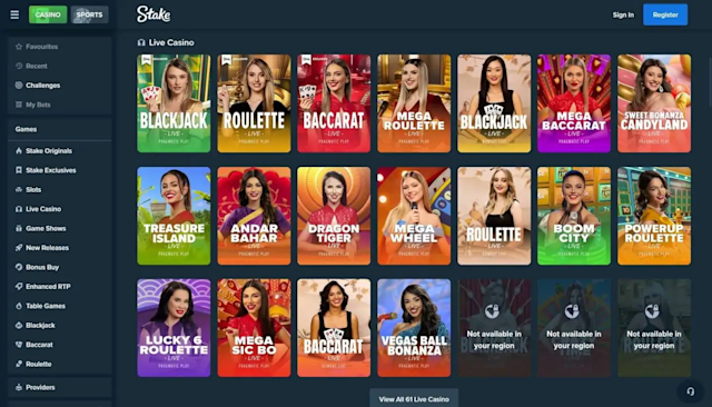 Stake's casino games cover everything modern online players expect, including a massive selection of online slots, exclusive options, and live dealer games. There are around 3,500 slots available, covering video slots, classic games, and progressive jackpots. Notable titles include Sweet Bonanza, Gates of Olympus, Break Da Bank Again Megaways, and Starburst.